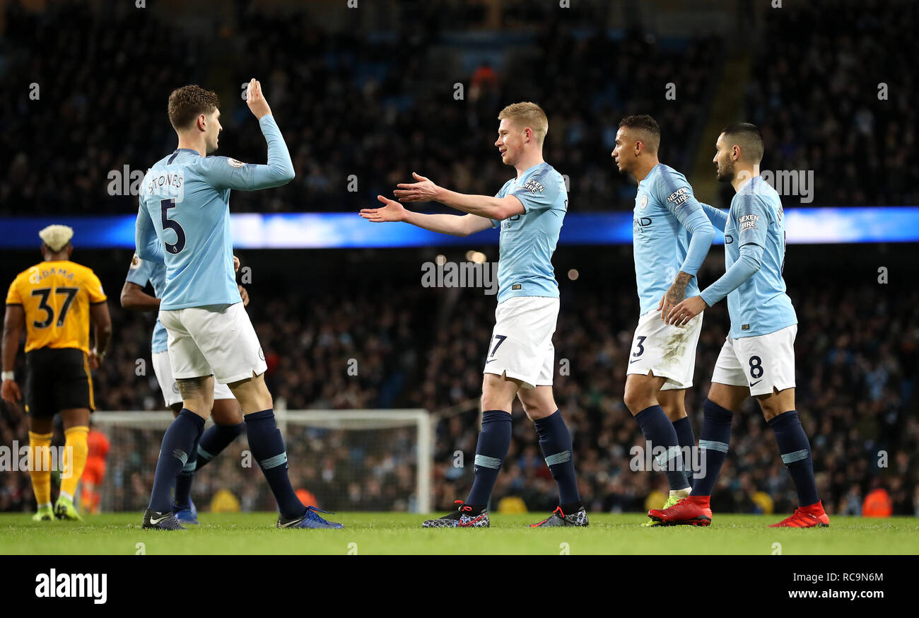 Manchester City Celebrate After Wolverhampton Wanderers Conor Coady Not Pictured Scores An Own Goal During The Premier League Match At The Etihad Stadium Manchester Stock Photo Alamy