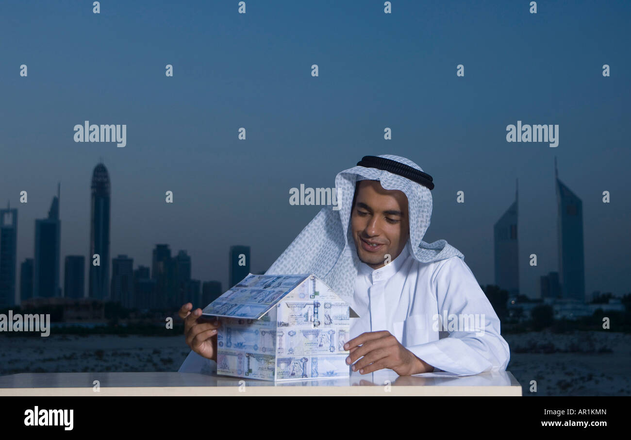 Young Arab Man Sitting At A Desk With Dubai City In The Background Holding A House Made Of Money Stock Photo Picture And Royalty Free Image Pic Wr0270409 Agefotostock