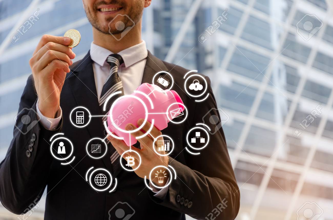 Midsection Smart Business Man In Black Suit Holding Piggy Bank Golden Bitcoin On City Background Digital Technology Virtual Currency Financial Investment Saving Money Payment Online Concept License Download Or Print For