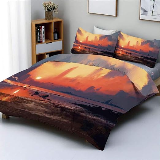Amazon Com Duplex Print Duvet Cover Set Queen Size Man On Sandy Beach With City Skyscrapers Skyline Sunset Oil Paint Graphicdecorative 3 Piece Bedding Set With 2 Pillow Sham Orange Blue Best Gift For Kids