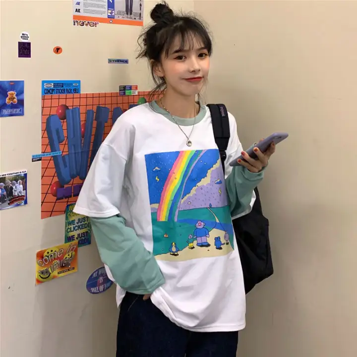 2020 College Style Loose Cute Cat Print Fake Two Piece Pullover Female Middle School Student Spring New Long Sleeved Shirt Tops Blouses Shirts Aliexpress