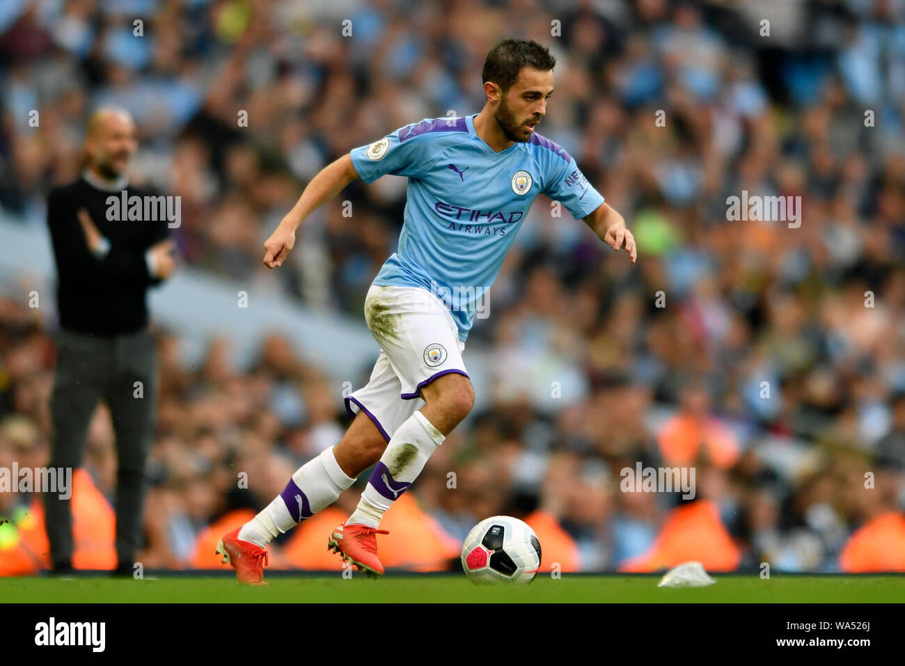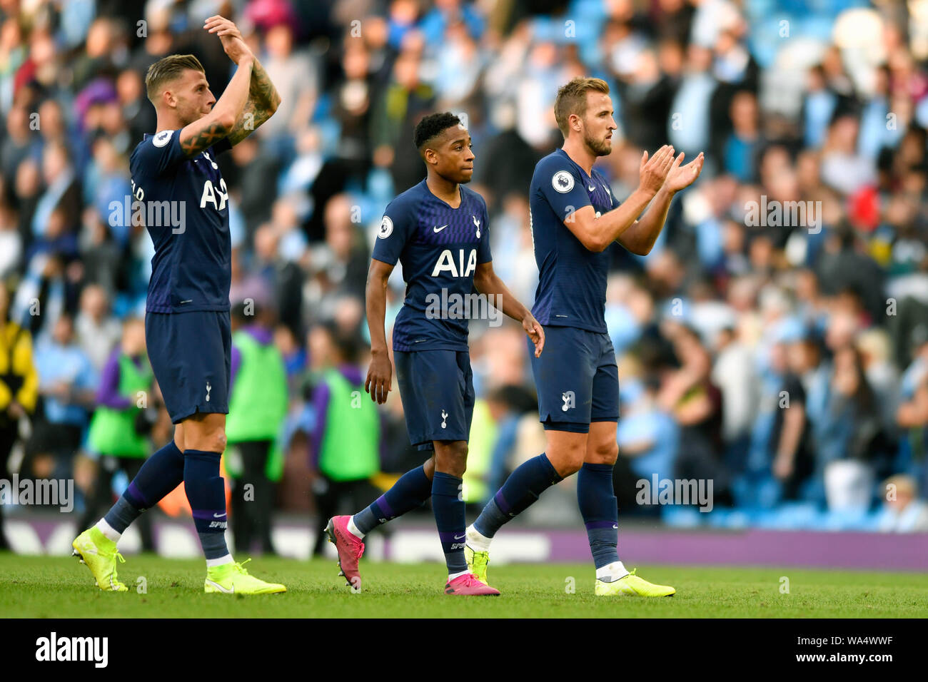 17th August 2019 Etihad Stadium Manchester Greater Manchester England Manchester City Versus Tottenham Hotspur Harry Kane Of Tottenham Hotspur Leads The Players To The Away Fans To Applaud Their Support At The