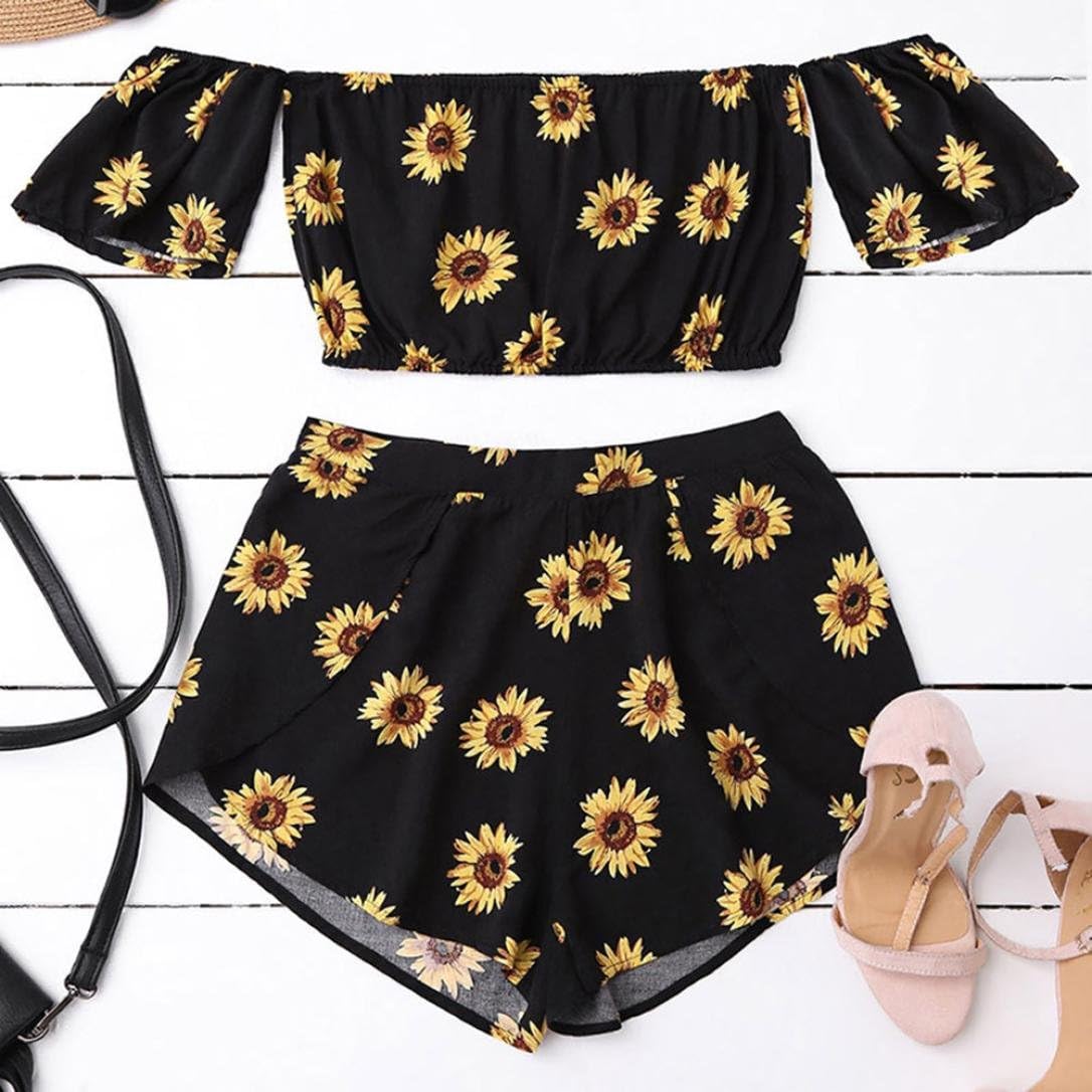Vemow Casual Two Piece Set Teen Girls 2020 Spring Summer New Sexy Women Off Shoulder Chiffon Slash Neck Printed Beachwear Crop Tops Set Amazon Co Uk Clothing