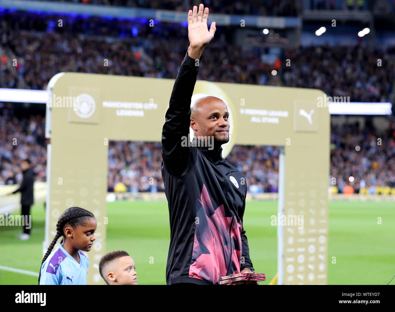 Manchester City Legend S Vincent Kompany Acknowledges The Fans Prior To The Beginning Of The Vincent Kompany Testimonial At The Etihad Stadium Manchester Stock Photo Alamy